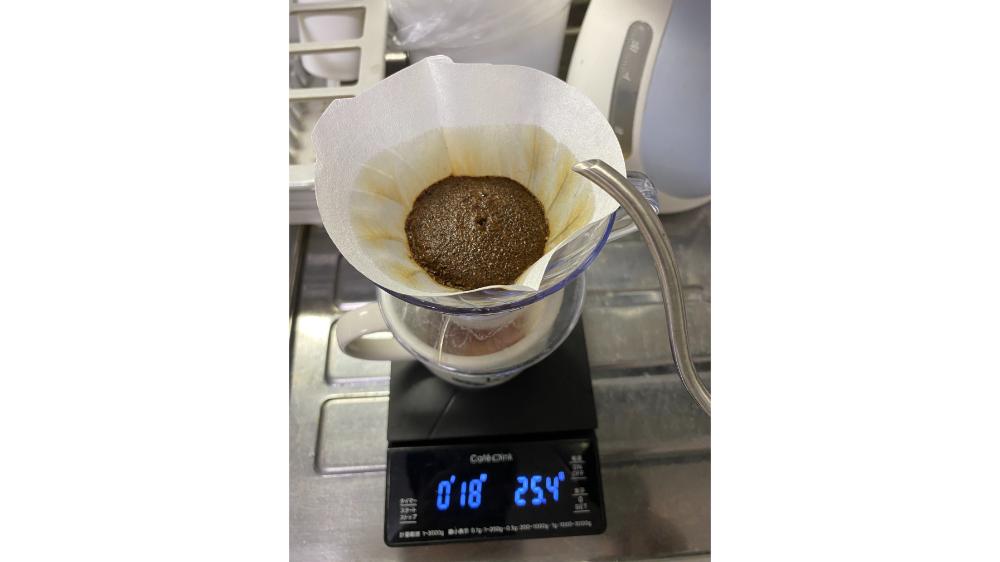 180ml程度のお湯を4回に分けて注ぎます。このときも「の」の字に優しく注ぎます。ドリッパー内のお湯がなくなるごとに注ぎ足します。